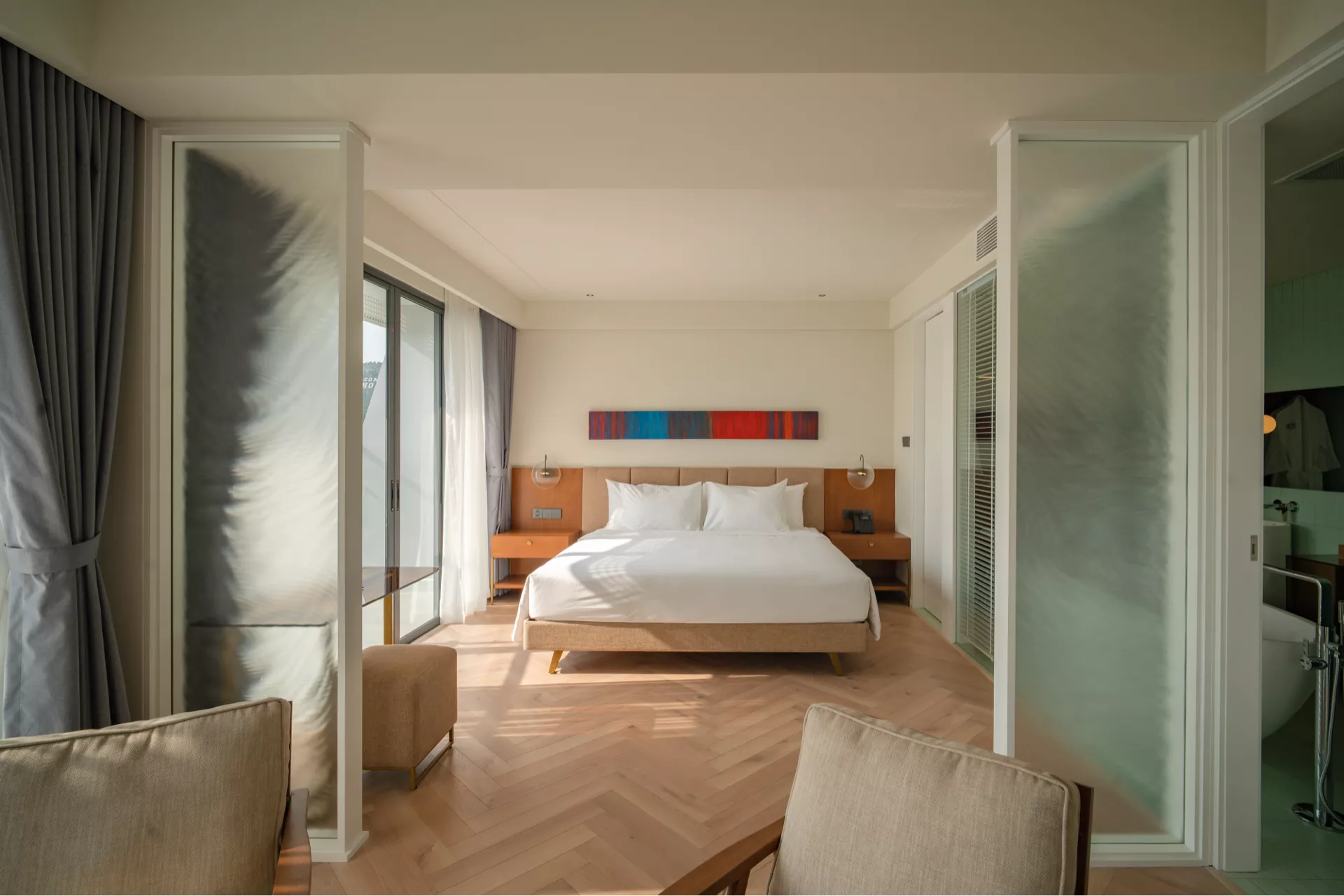 Phòng có ban công riêng với hai lựa chọn tầm nhìn: hướng thành phố sôi động hoặc tầng cao với góc nhìn thoáng đãng ra biển. Không gian rộng rãi với giường đôi 2m x 2m êm ái, mang đến sự thoải mái tối đa cho kỳ nghỉ của bạn. Trang bị đầy đủ tiện nghi hiện đại như TV thông minh, minibar, két sắt, bàn làm việc, wifi tốc độ cao và phòng tắm vòi sen, giúp bạn thư giãn sau một ngày khám phá.