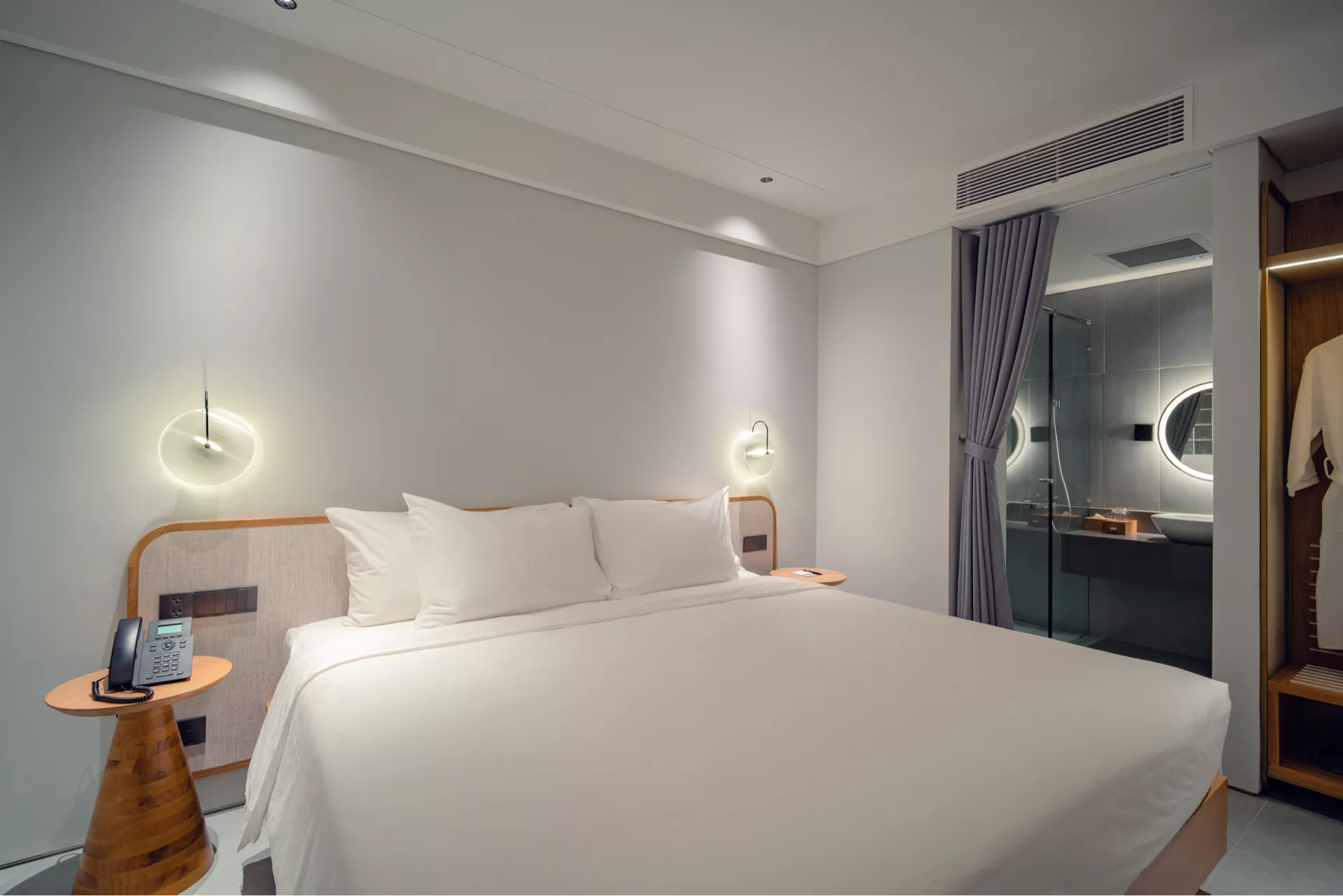 Phòng có ban công riêng với hai lựa chọn tầm nhìn: hướng thành phố sôi động hoặc tầng cao với góc nhìn thoáng đãng ra biển. Không gian rộng rãi với giường đôi 2m x 2m êm ái, mang đến sự thoải mái tối đa cho kỳ nghỉ của bạn. Trang bị đầy đủ tiện nghi hiện đại như TV thông minh, minibar, két sắt, bàn làm việc, wifi tốc độ cao và phòng tắm vòi sen, giúp bạn thư giãn sau một ngày khám phá.