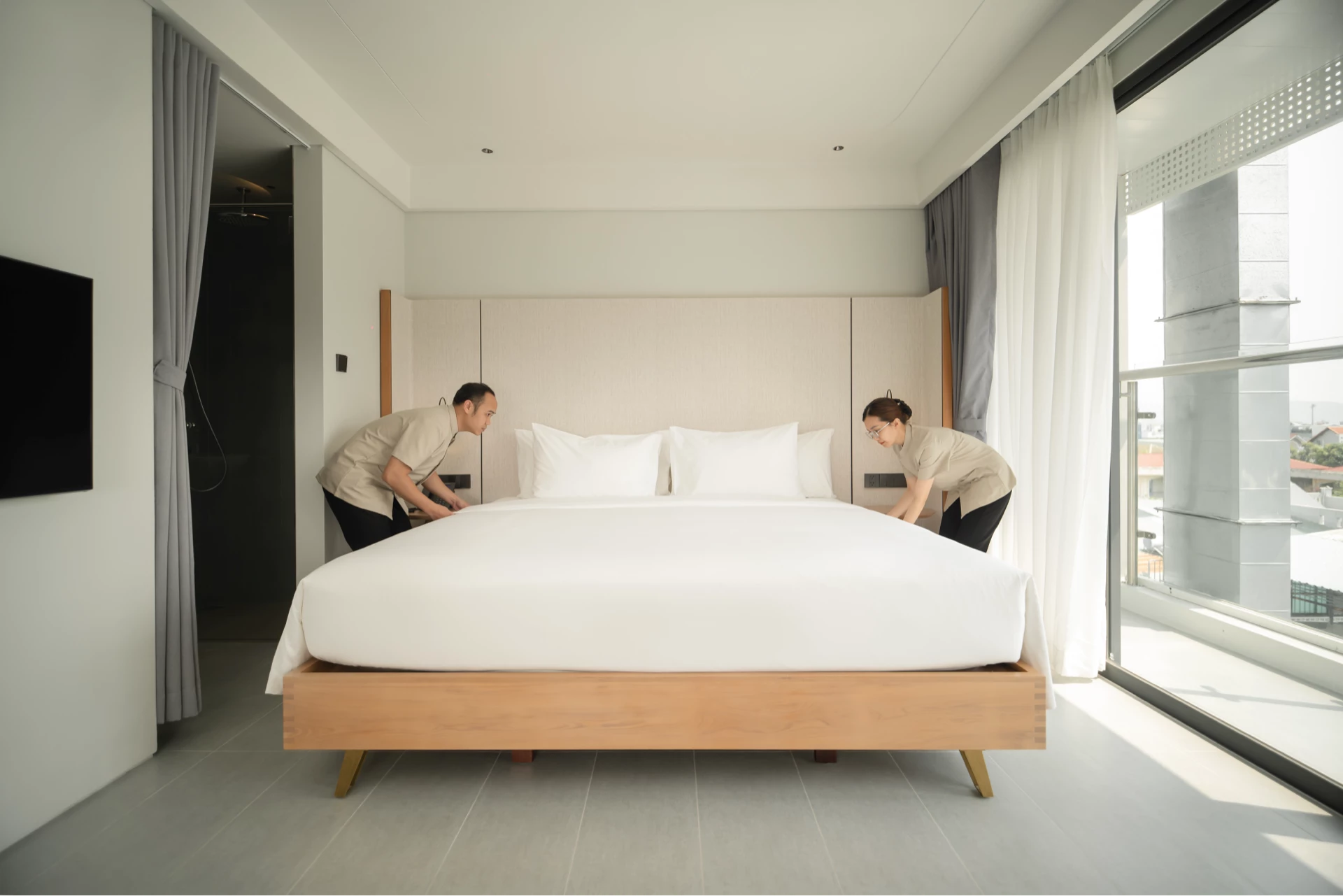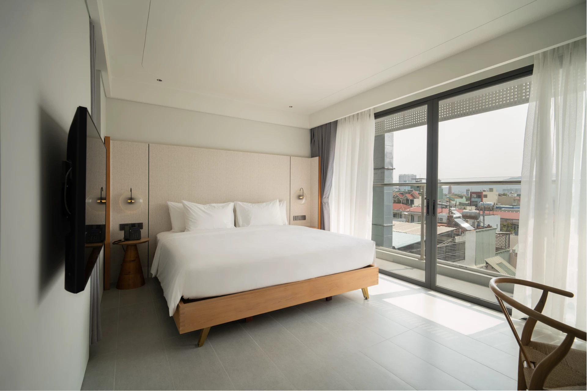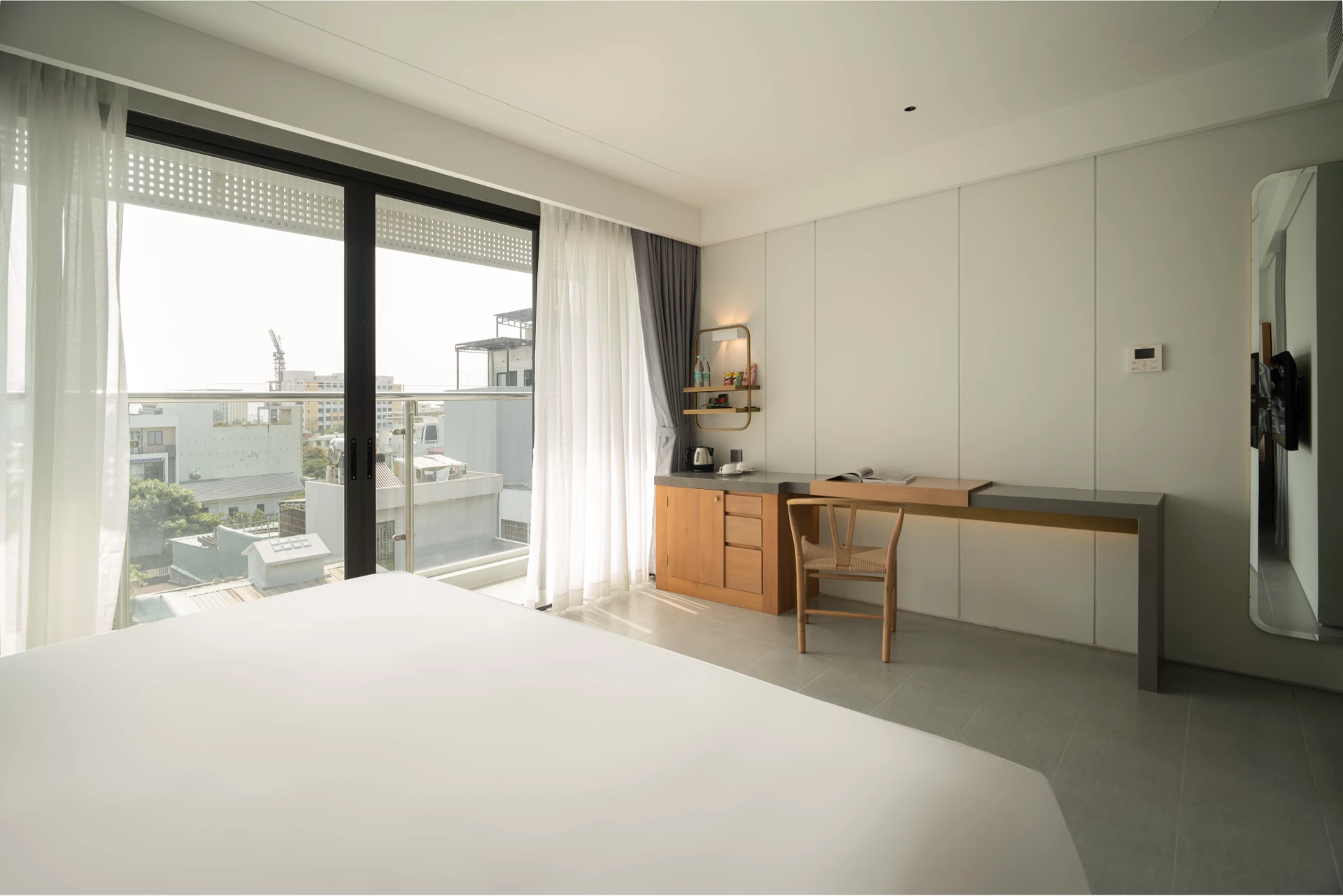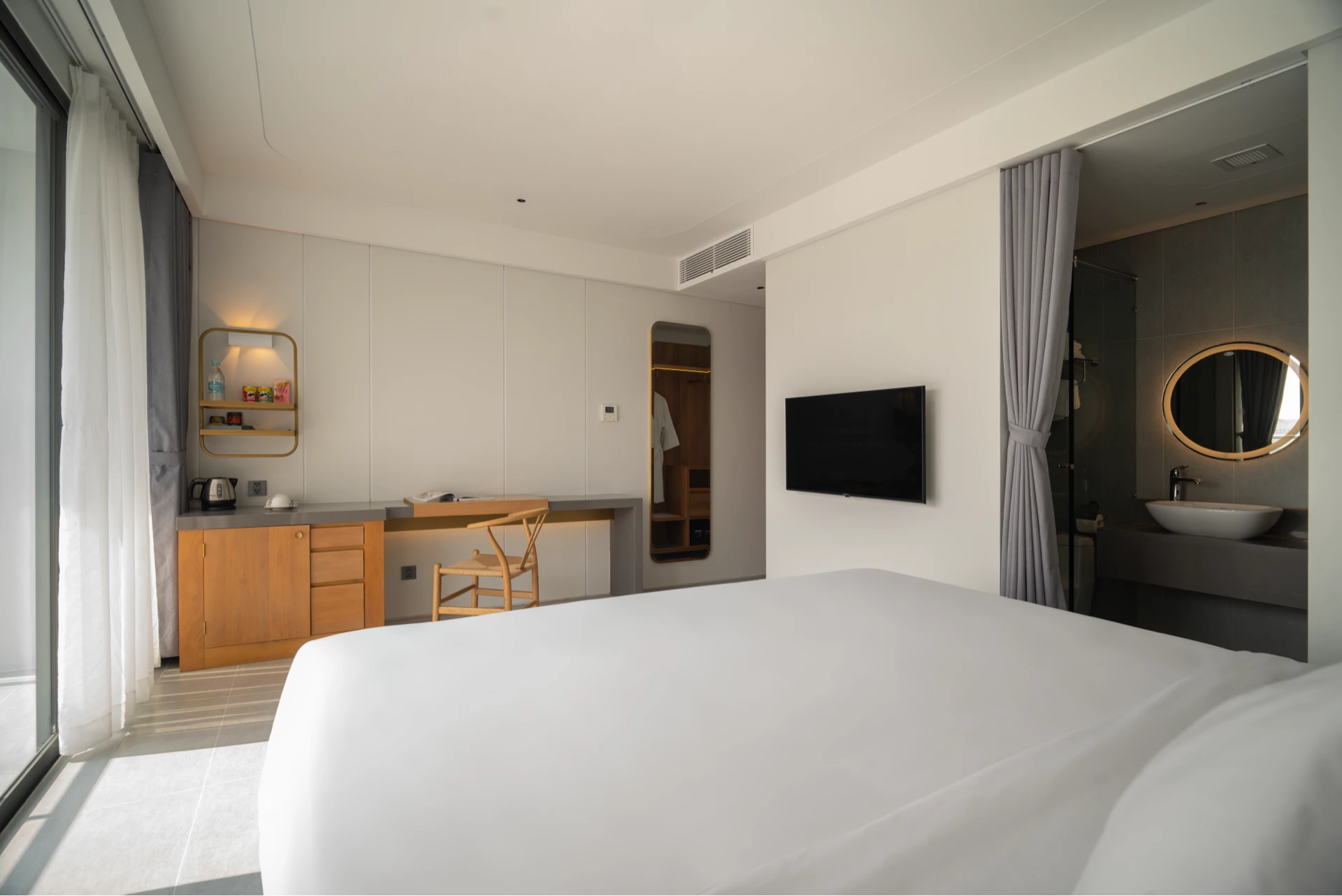 The room has a private balcony with two view options: the vibrant city view or the high floor with a clear view of the sea. Spacious space with a soft 2m x 2m double bed, bringing maximum comfort to your vacation. Fully equipped with modern amenities such as smart TV, minibar, safe, desk, high-speed wifi and shower, helping you relax after a day of exploration.