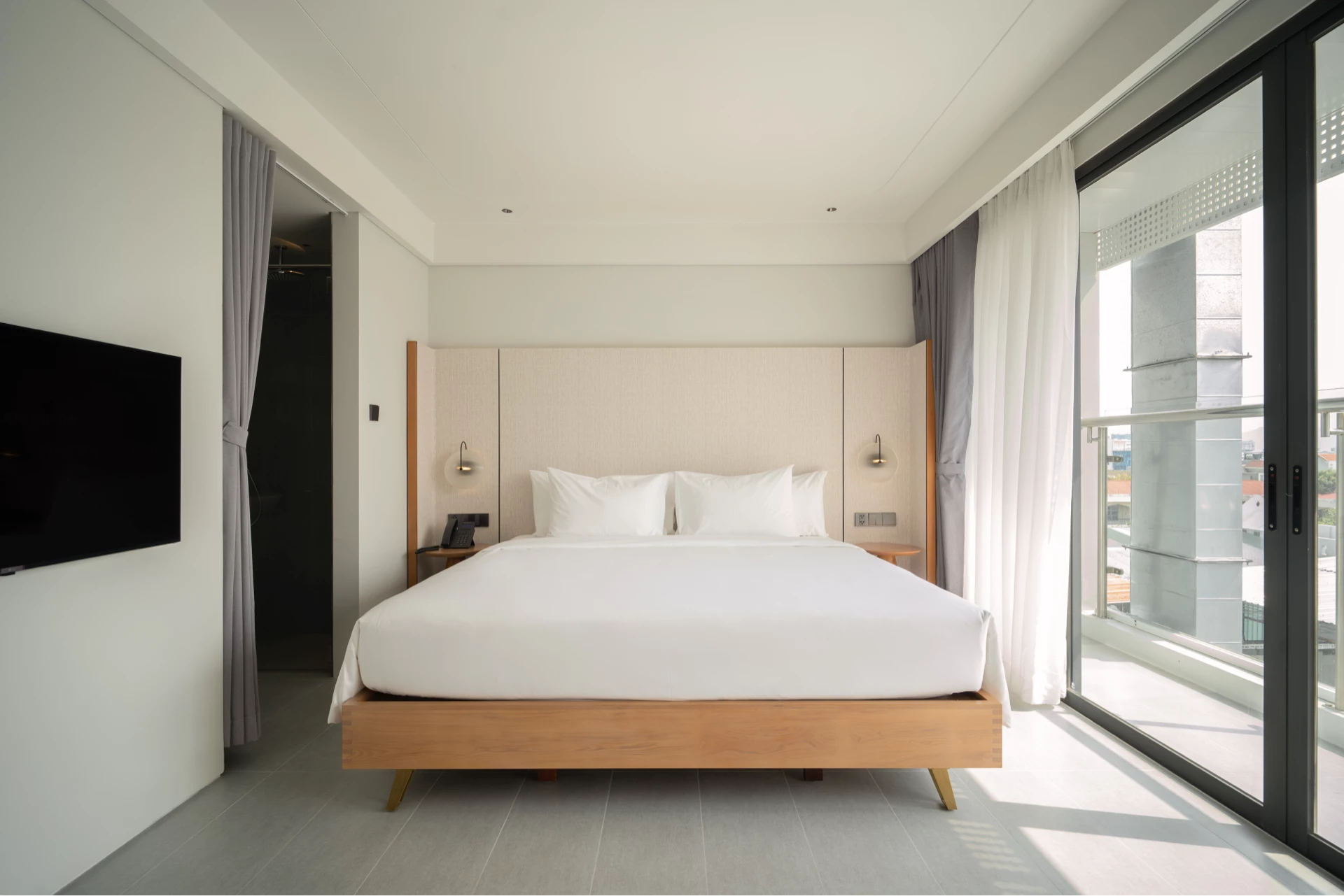 Spacious room with private balcony, where you can enjoy the bustling city view from above. Soft 2m x 2m double bed and comfortable furniture bring absolute comfort. Fully equipped with smart TV, minibar, safe, desk, high-speed wifi and shower, helping you have moments of complete rest.